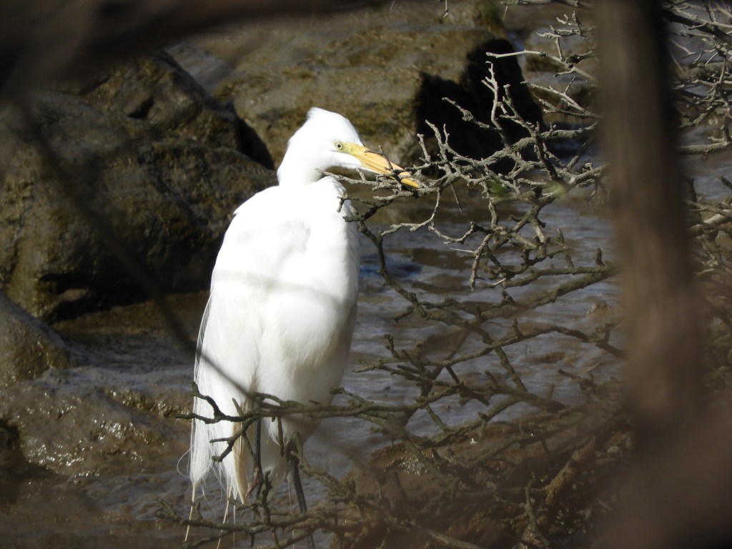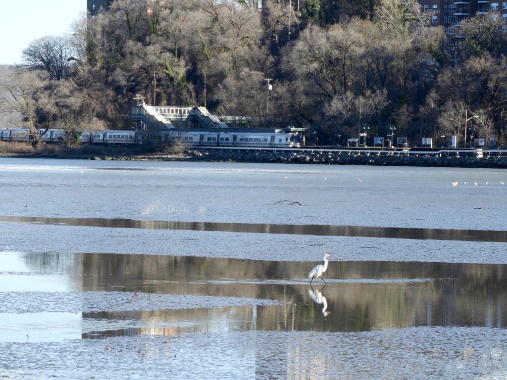 As a tidal estuary, the Hudson River rises and falls throughout the day, spilling into the Spuyten Duyvil Estuary. The Great Egret may be seen fishing when the water levels are right. Look for a time between high tide and low tide to see the egret in the water. At high tide, the egret may perch on a rock, on a pier, or on a comfortable spot near land. Tide charts for Spuyten Duyvil Creek can be found online.
