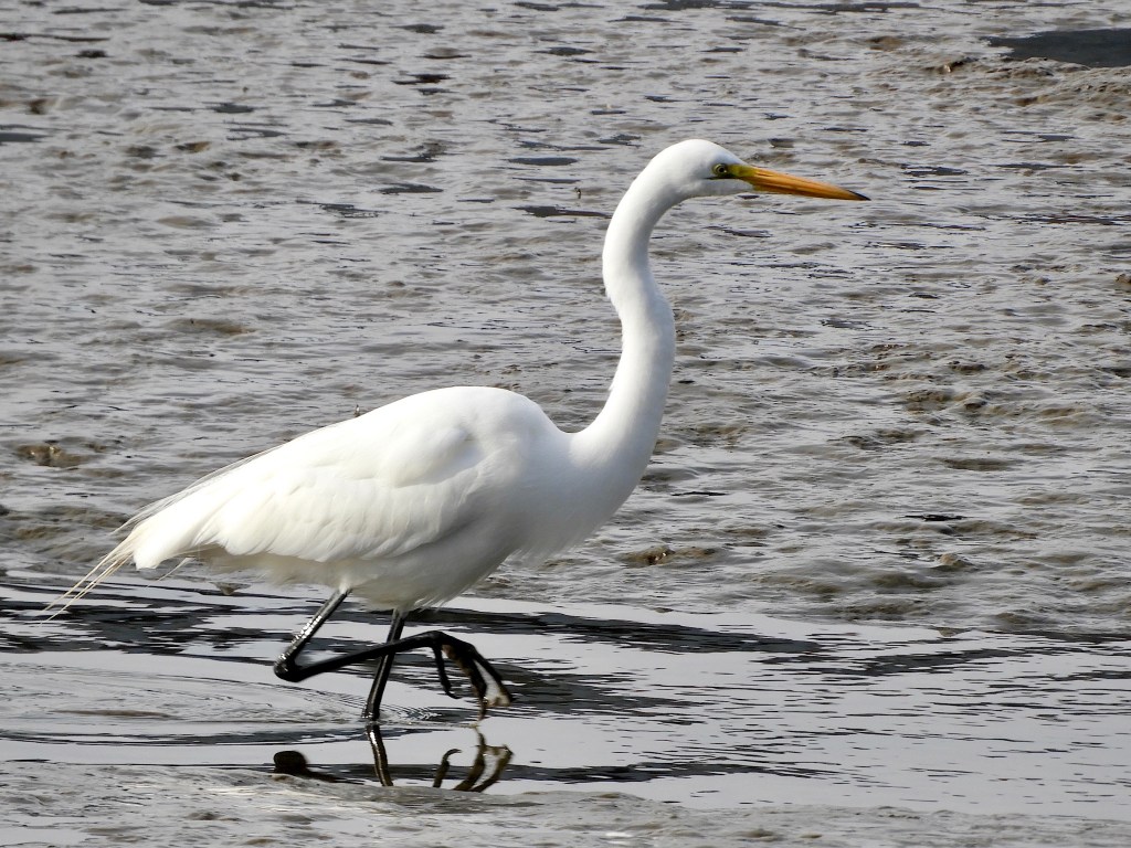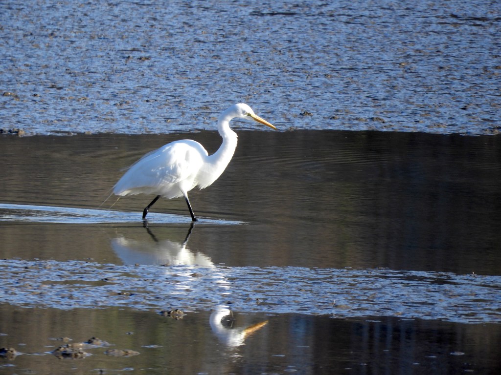 Later that afternoon, when the tide was low, I returned to find one lone Great Egret exploring the edges of the Salt Marsh and wading in the ribbons of the creek. Over the past nine years, I have observed just one egret here. Maybe this is the same one. (The average lifespan for a Great Egret is 15 years.)