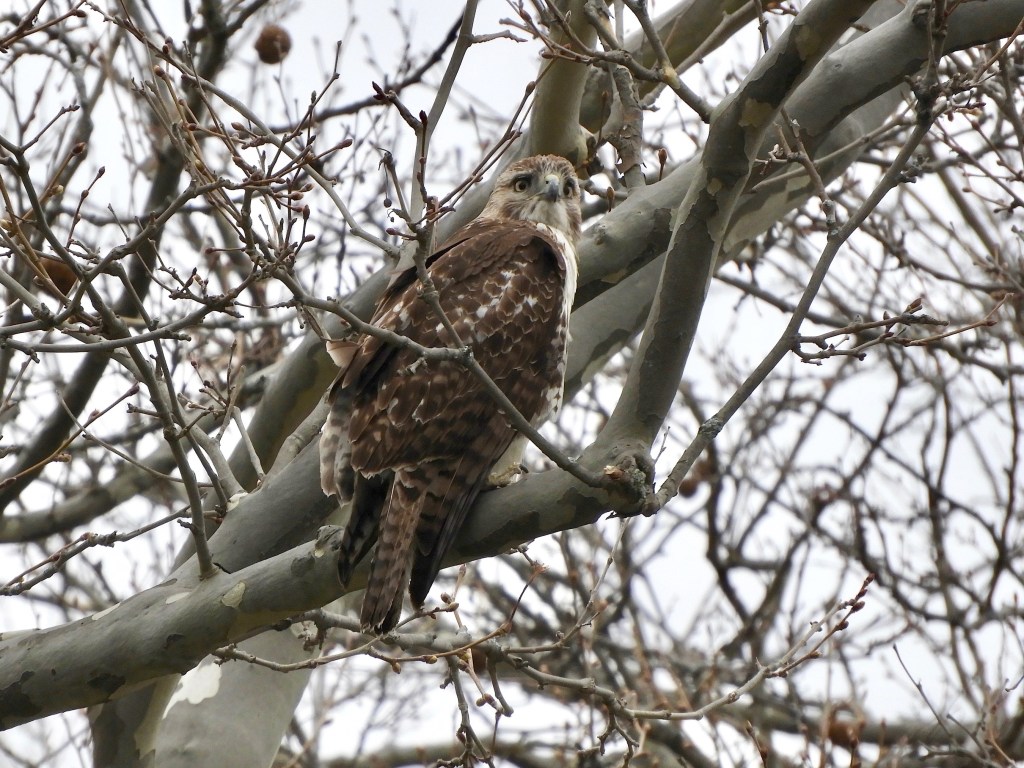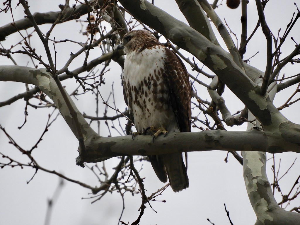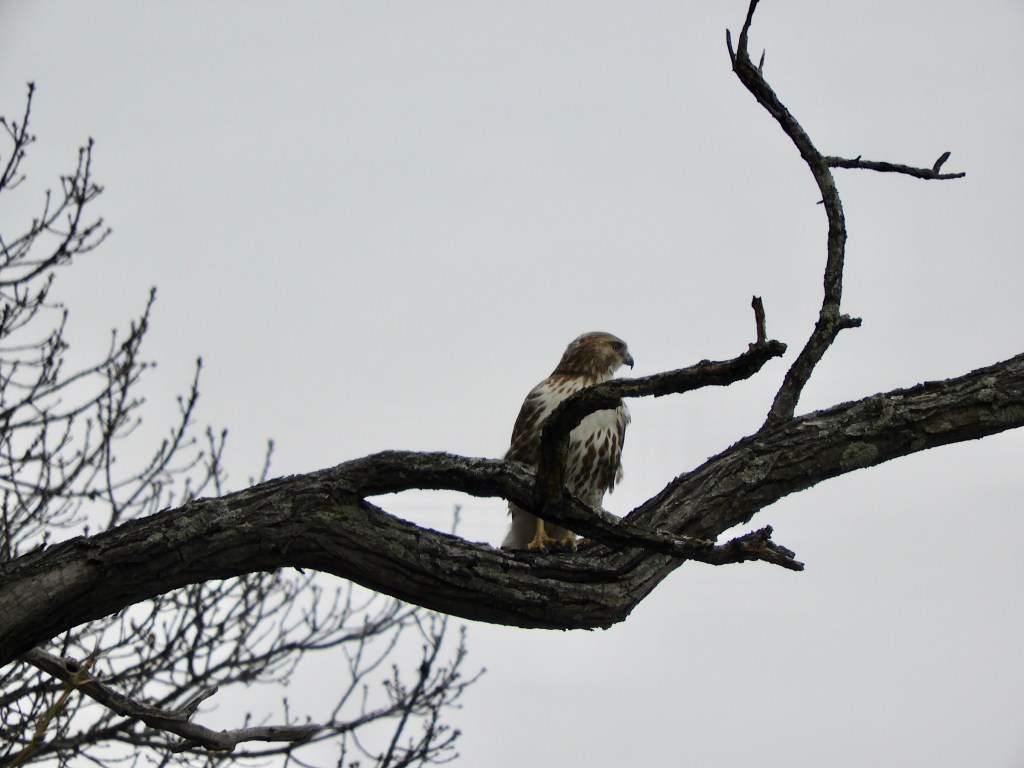On a subsequent walk in mid-afternoon, I saw one hawk swoop to a high branch in a tree near where the forest curves around the athletic field. This sheltered spot would provide excellent views of the surrounding landscape. The winds had died down, and it was time for some vigilant perching.