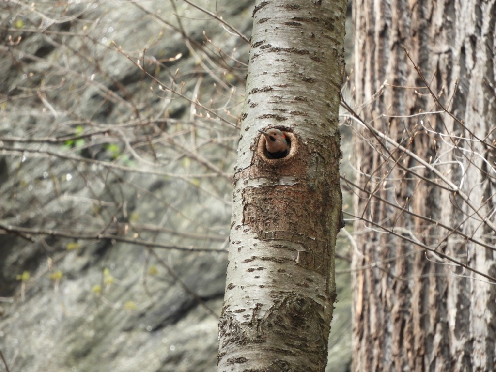 Woodpeckers are commonly seen and heard all year round throughout Inwood Hill Park, and now the migratory Northern Flickers have joined them. Downy Woodpeckers are common here, and so are Red-bellied Woodpeckers. A Hairy Woodpecker and a Yellow-bellied Sapsucker may sometimes be seen. A Pileated Woodpecker, which I have yet to see, is the Holy Grail. (See update from April 21, 2023).