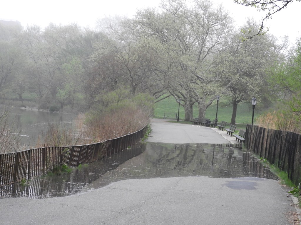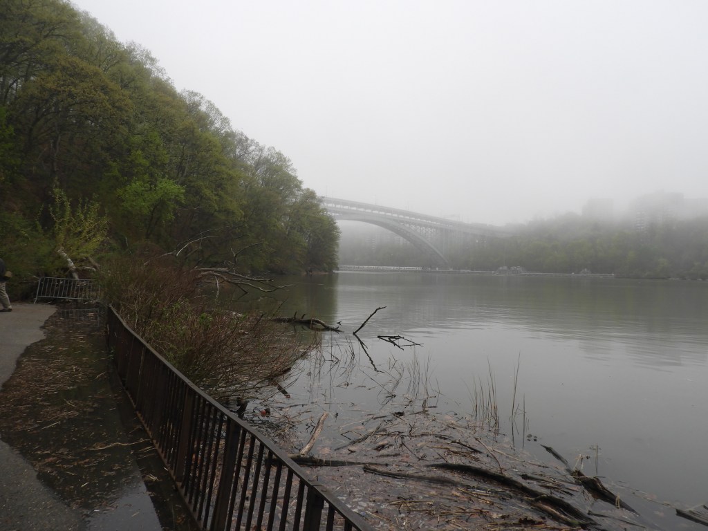 A fog settled over the Salt Marsh in Inwood Hill Park early this morning. It was also a time of high tide, and the tide was higher than usual. The regular denizens such as the Great Egret were away. A couple of Song Sparrows were present. Looking closer at the tree that reaches over the water, though, three Northern Rough-winged Swallows could be seen preening their feathers or resting for the next flight.
