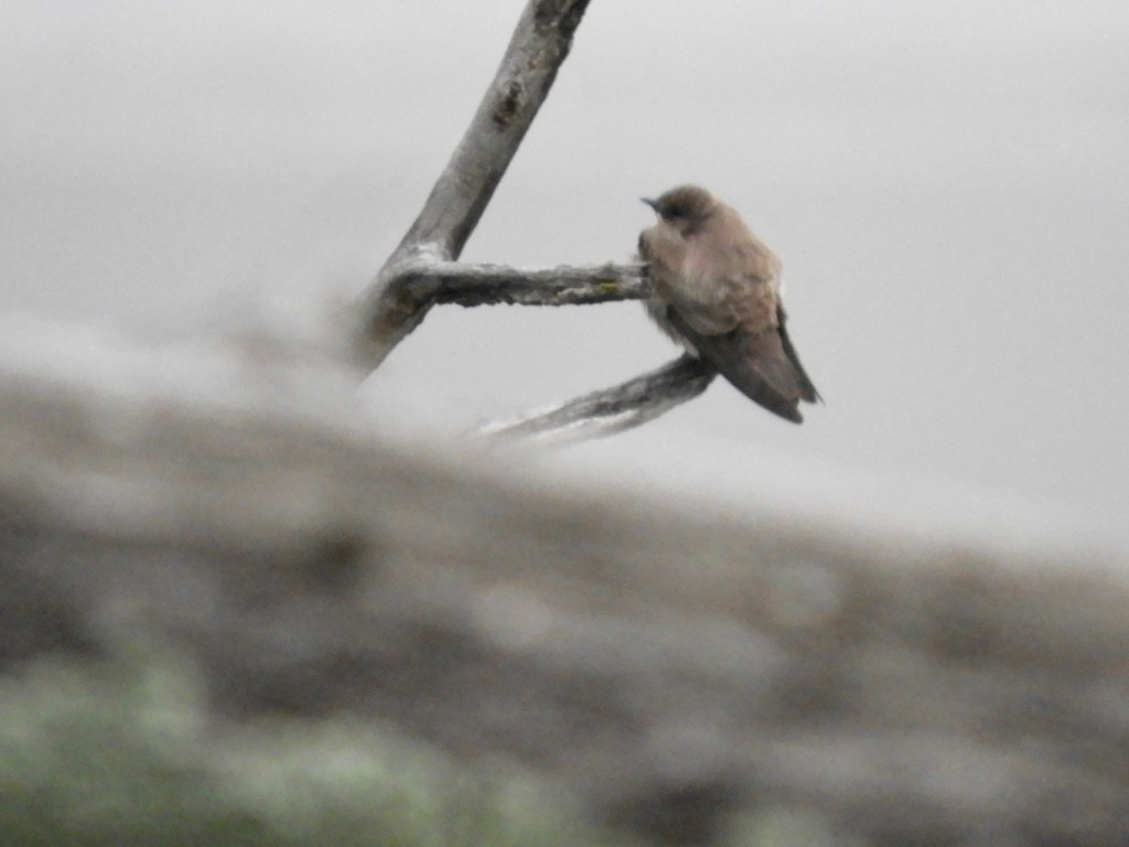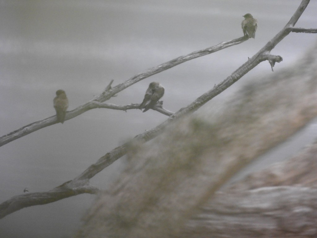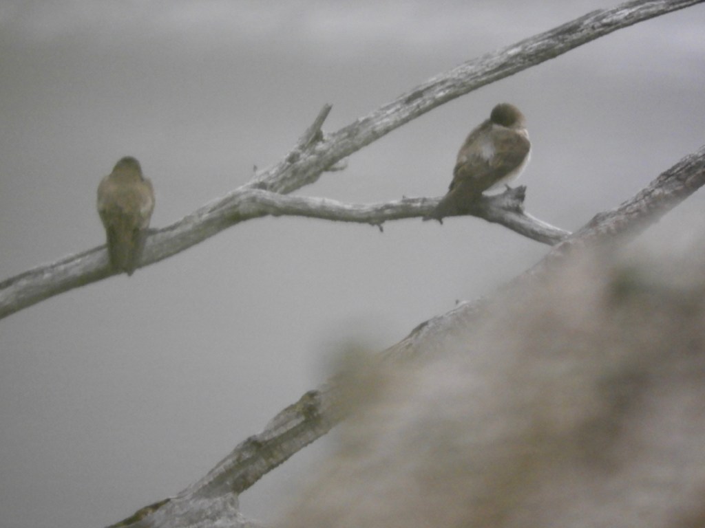 Northern Rough-winged Swallows do not particularly announce themselves on a drizzly morning such as this. They are dullish brown in color, fading to white on their chests, and they have long bodies and smallish heads. Their name derives from the tiny hooks on the edge of their outer wing feathers, giving them a rough appearance. Such details would be hard to discern even in clear weather.