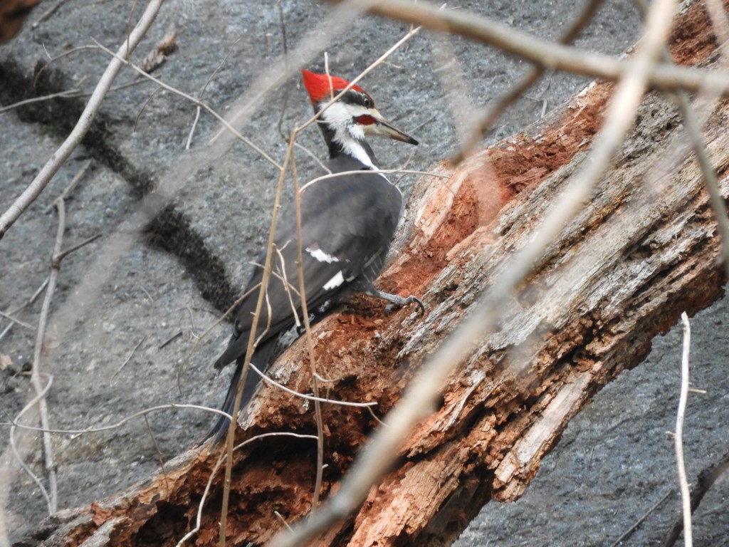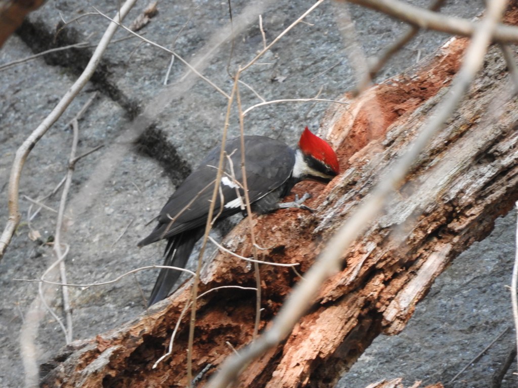 I have always wanted to see a Pileated Woodpecker in Inwood Hill Park, and I finally saw one this morning. I was wrapping up my birding walk and ready to go home when I met a fellow birder who let me know about the Pileated in the Clove. He said he learned about it from another birder. I wasn’t far away so I thought that maybe I could find it.
