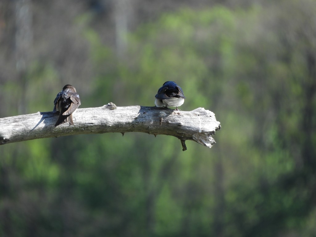 The swallows also provide aerial entertainment with their swift flying over the waters and the nearby meadow. They depend on all matter of flying insects for food. They will rest or preen on the limb over the water and then take off for their frequent flights.