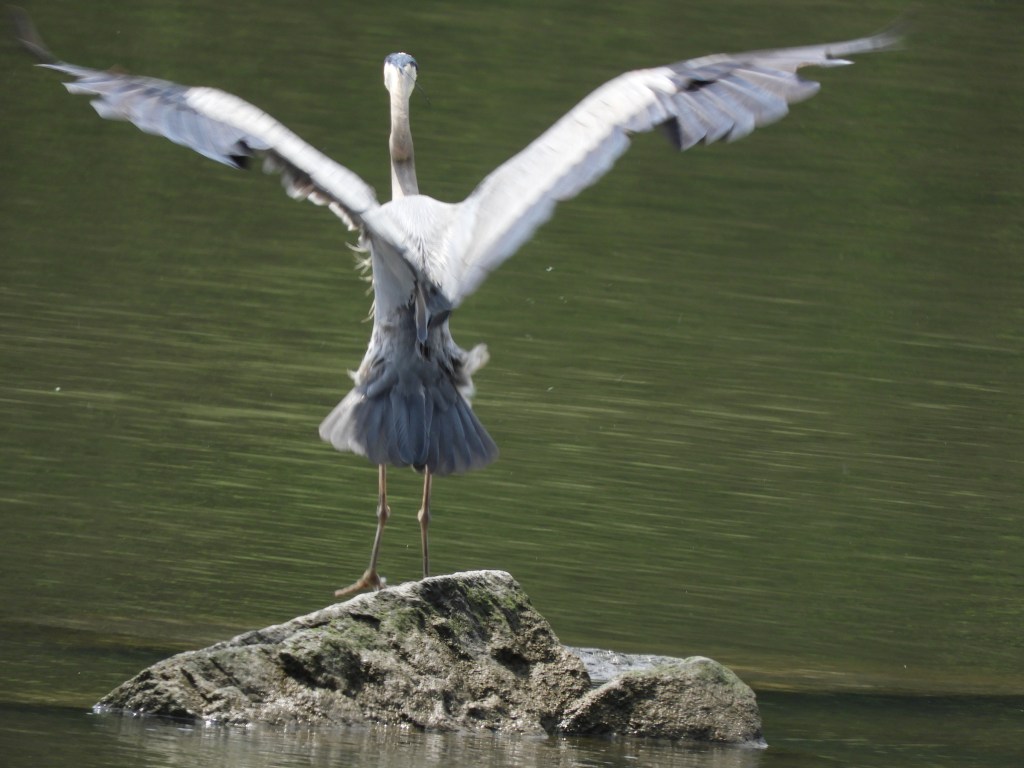 When the Great Blue Heron does make the flapping moves and a short flight, watch for those magnificent toned white and bluish wings.