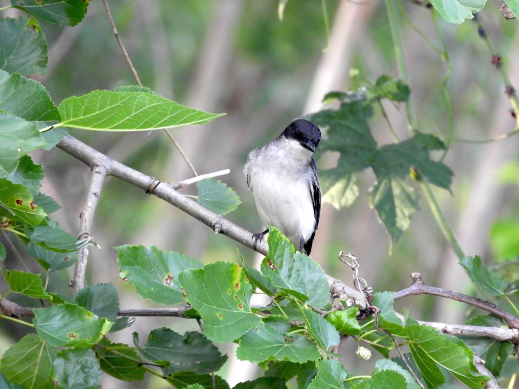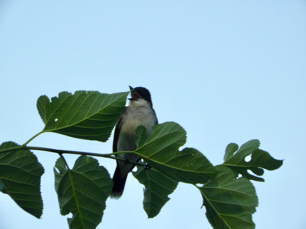 Eastern Kingbirds frequently vocalize in a high pitch metallic voice. On the Peninsula in Inwood, the bird finds itself in competition with Northern Mockingbirds as well as a Song Sparrow that has commanded a tree facing the Harlem River. The birds seem to have worked out an agreement.