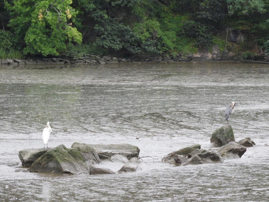 On the morning of August 8, while the continuing Great Egret and the Great Blue Heron fished or preened in the main marsh, two Great Egrets flew over the river from the north side of the river to Muscota Marsh on the south side.