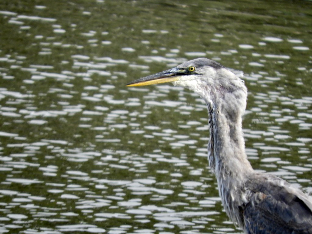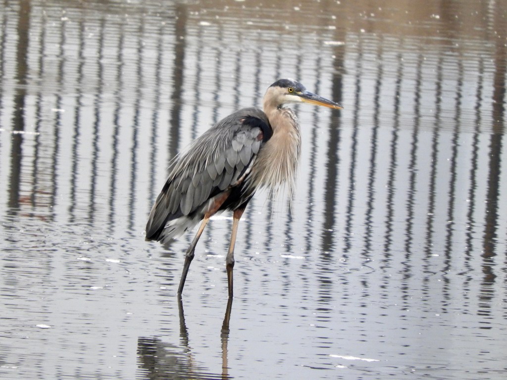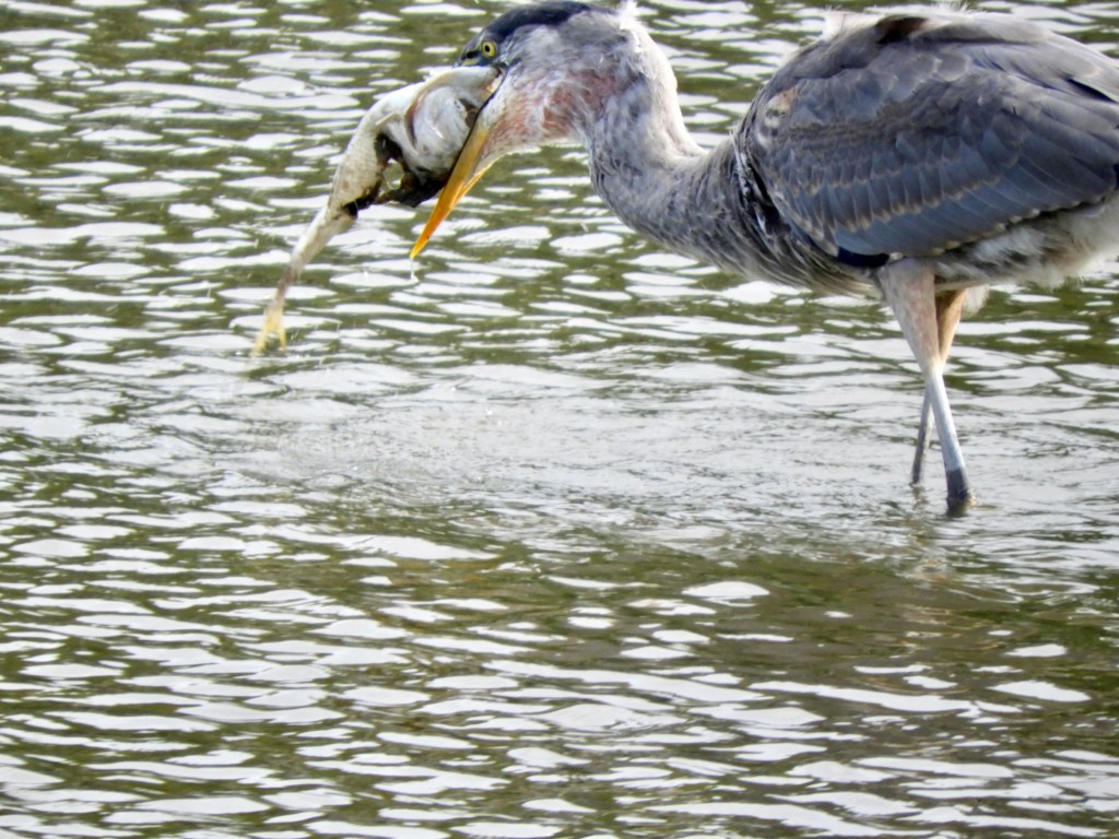 The plot was simple. Two Great Blue Herons flew in from the direction of the Hudson River and the Henry Hudson Bridge, one following the other. The youngest one, one without fully-grown chest feathers, took to the waters of Muscota Marsh for fishing opportunities. This heron had great luck, bringing with it a healthy appetite and the determination to catch and eat the largest fish in the river.