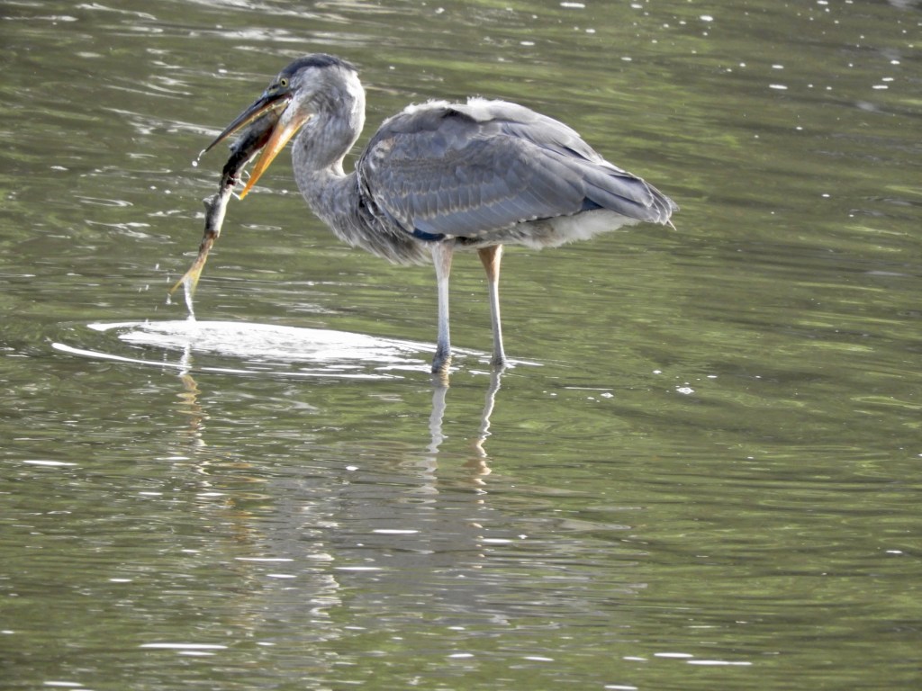At the same time the heron was fishing the waters, several human fisherman lined the shore and could only sit back and admire the heron’s skills. The young heron struggled to swallow several large fish at the same time but was successful.