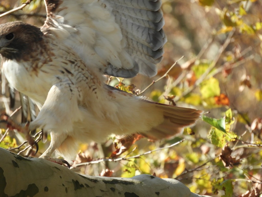 After the hawk dispensed with lunch, it moved around the tree and showed off its characteristic red tail. It took its time to fly away, finding another destination of interest in a loftier and wilder section of the park to the west.