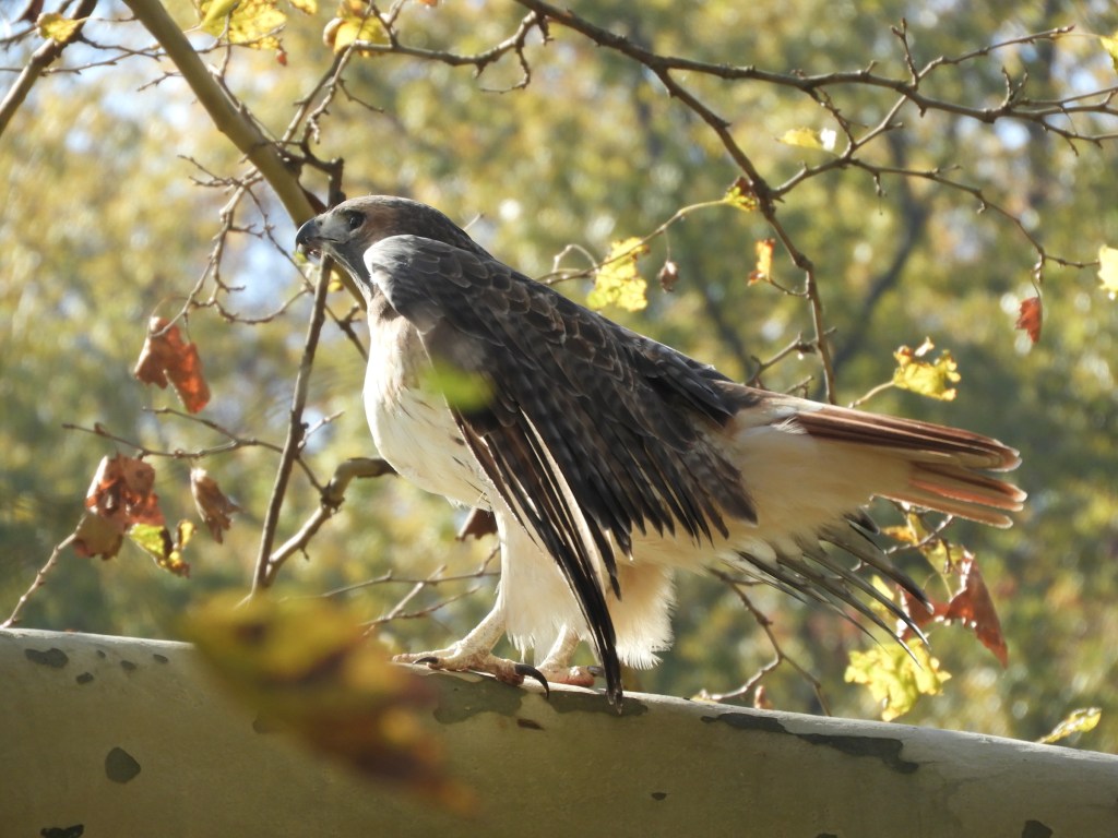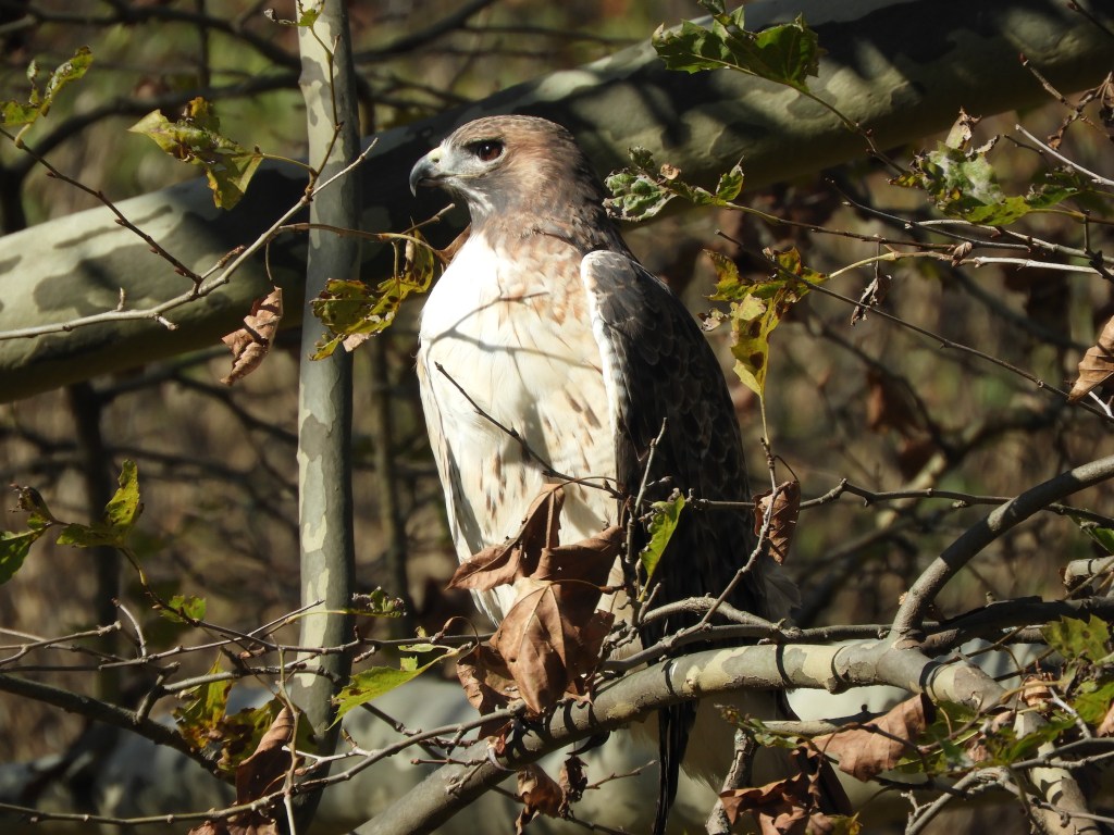 On Wednesday afternoon, I saw another Red-tailed Hawk sitting on one of the lower branches of the plane trees. It was clearly young, having that ruffled unfinished look to it, and its tail showed horizontal bandings and muted color. Its eyes were pale in contrast to the adult’s deeper amber.
