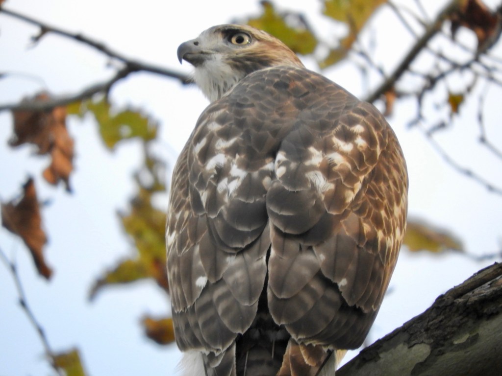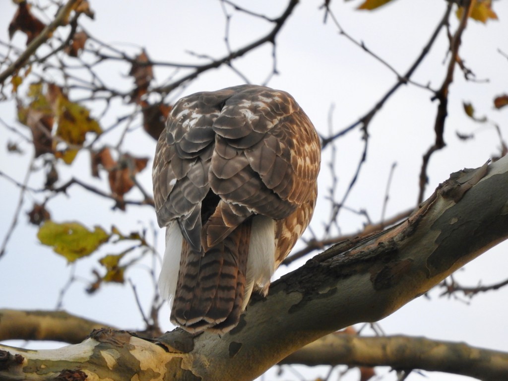 The London planetrees adjacent to the groomed salt marsh trail provide excellent viewing for all types of birds but especially for this Red-tailed Hawk in autumn. The dying leaves and mottled bark nicely complemented the colors and patterns of the hawk. The hawk could easily adjust its perches among the tree’s strong branches.