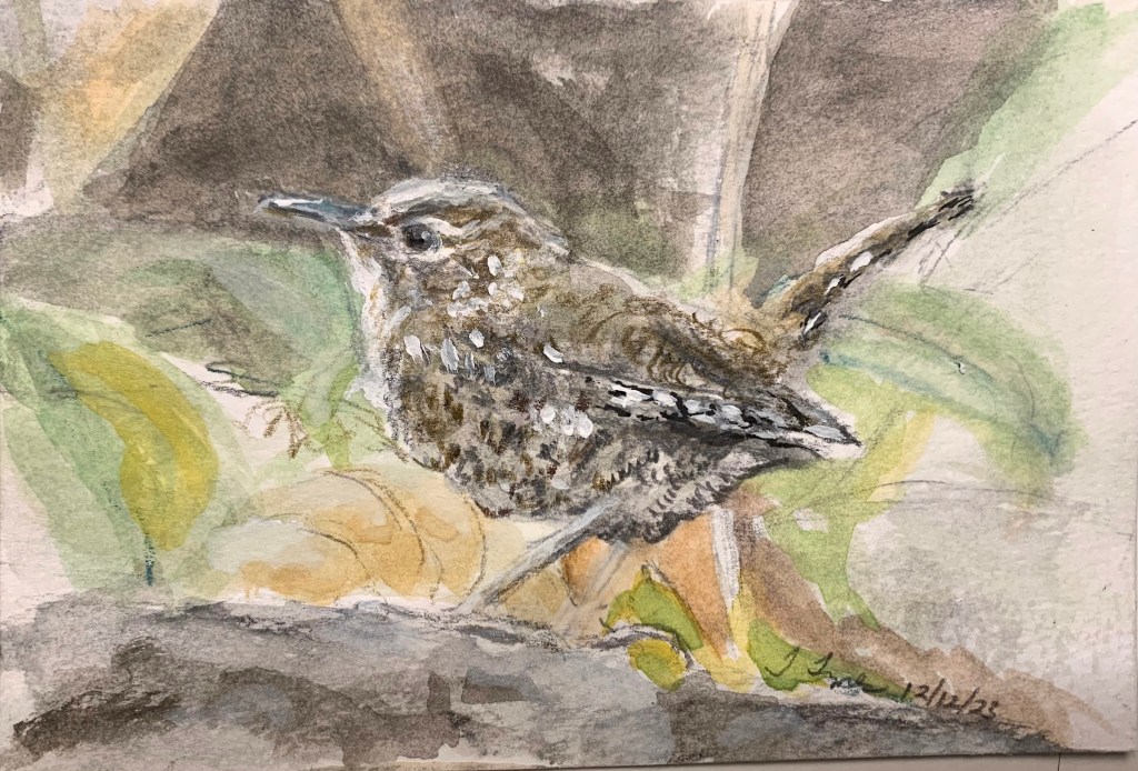 Study for a Winter Wren. 4″ x 6″. Watercolor, colored pencil, gouache, and graphite on Strathmore watercolor postcard. December 12, 2023.