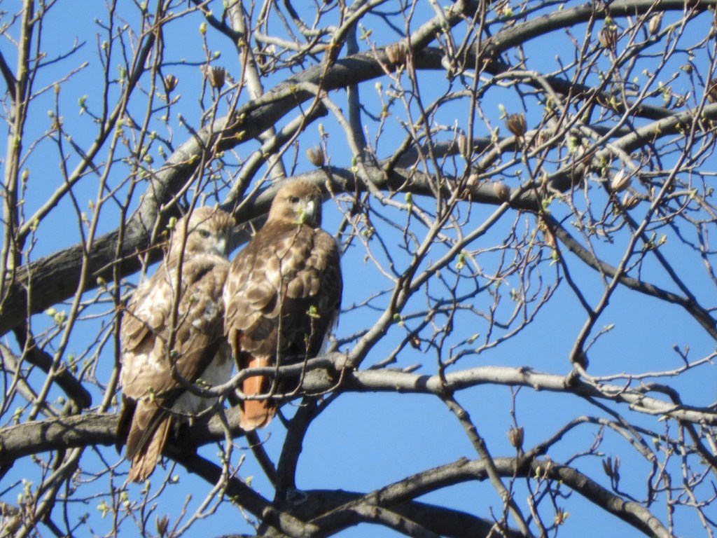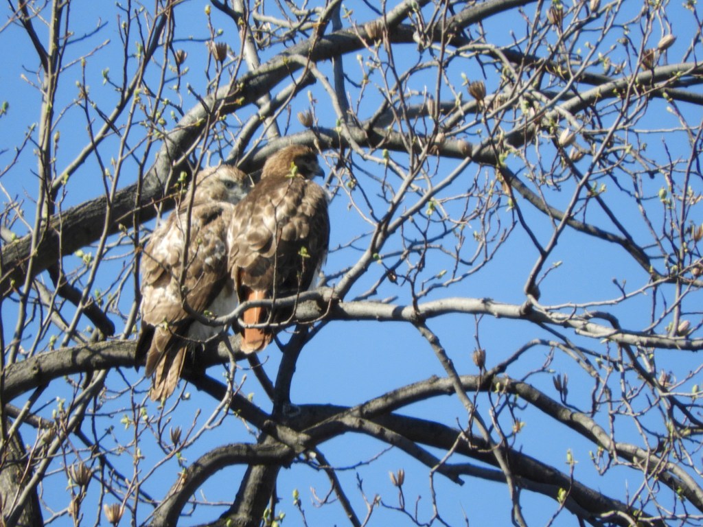 On the afternoon of March 25, 2024, I was just setting out on a bird walk when I spotted these two Red-tailed Hawks perched high in a tulip tree in Inwood Hill Park. It was a pleasant spring day. School had let out, and teenagers were busy playing on the basketball and handball courts below the tree. Pedestrians were out strolling, and the guy that gathers and rearranges trash was sitting on a park bench trying to restrain a dog. There was a lot going on.