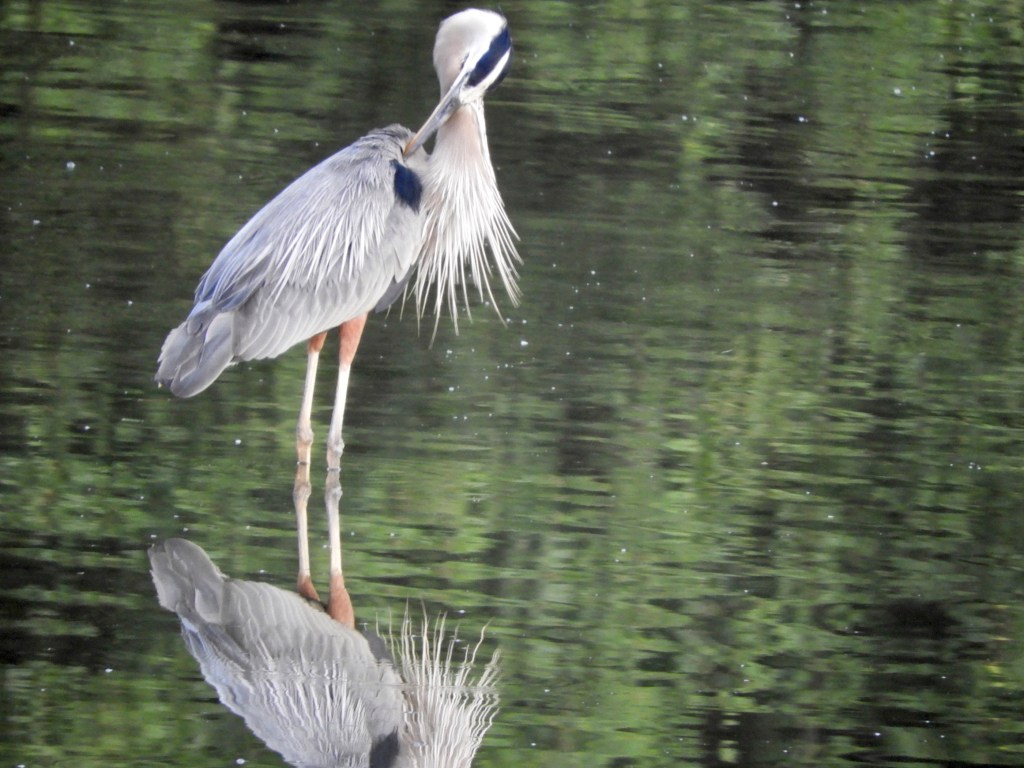 Walking to the end of the peninsula, I spotted a Great Blue Heron in the waters between the Salt Marsh and Spuyten Duyvil Creek. The heron had found a good place to preen, and its reflection in the water mirrored its routine. I also took in the wider view of the Henry Hudson Bridge and the Palisades beyond. For the cover image of this post, look for the heron in the leafy shadows at the edge of the morning light.