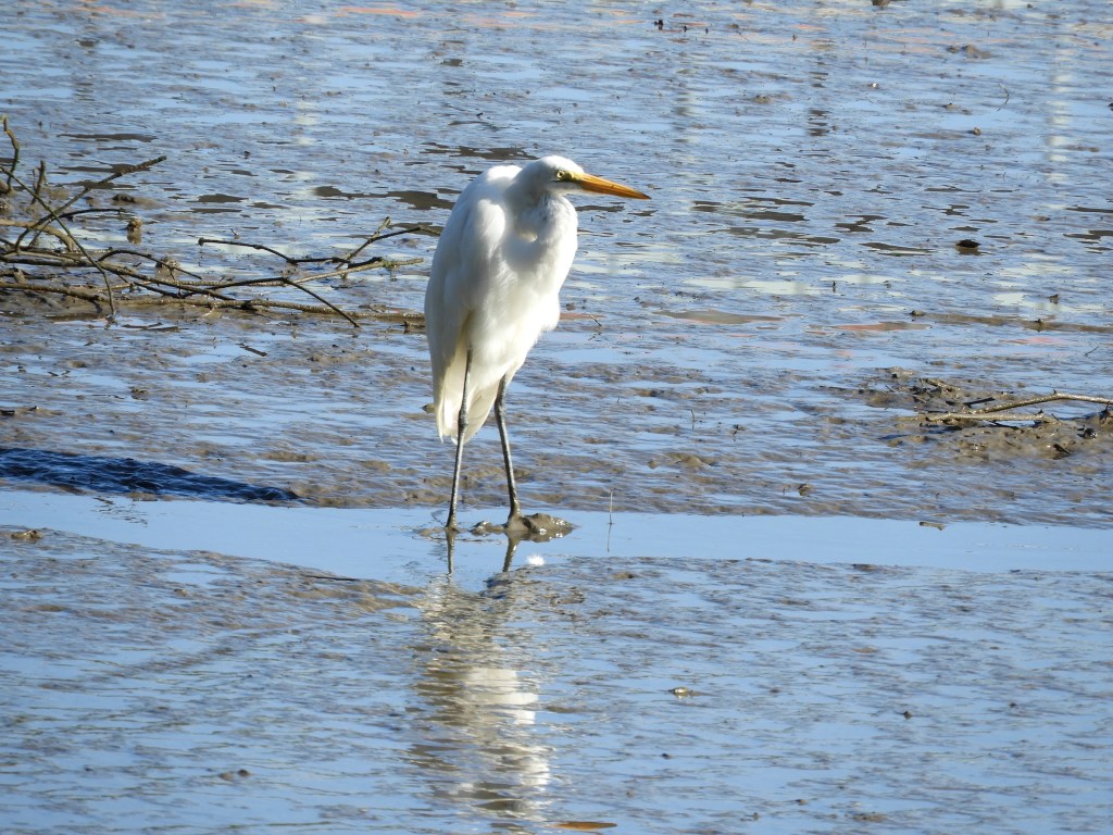 On the walk home, the resident Great Egret had assumed its chore of foraging for fish in the tide. The coast was clear.