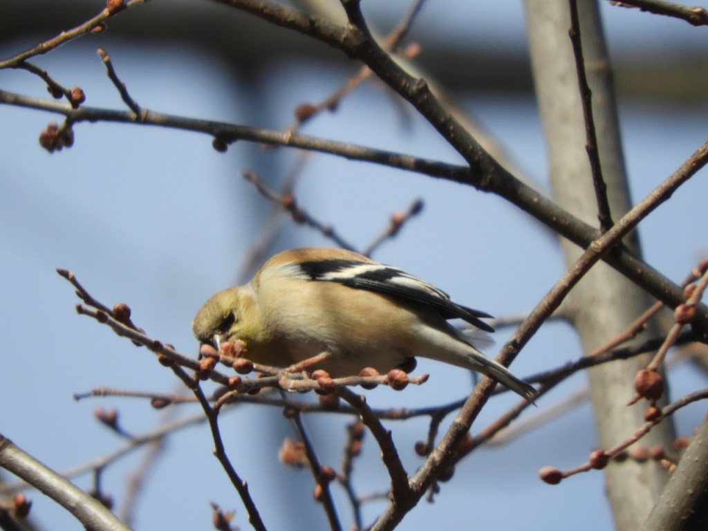 This past week, near the stone stairs at W. 207th Street in Inwood Hill Park, American Goldfinches have been busy pulling apart the new buds on elm saplings and gorging on them. They flit about a group of young trees, opening the buds and chewing on the flowers. On the morning of February 28, I counted nine goldfinches.