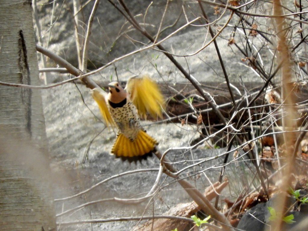 I had heard the wild calls of the Northern Flickers for a week before I saw them. On the morning of March 29, I came upon two male flickers engaged in a territorial display. When one flew off, I managed to catch its flight. As I set my camera for continuous shooting in sequence, I can sometimes capture a good flight sequence.