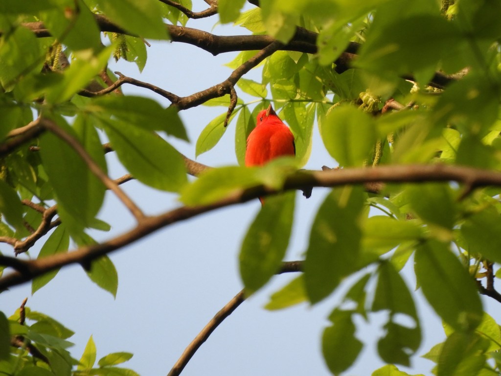 Imagine my surprise, then, when a Scarlet Tanager was the first bird I spotted shortly after sunrise on the first of May. I had been chasing after the many Baltimore Orioles along the easternmost ridge of the park. I thought I saw one, but the scarlet glow of the tanager gave it away.