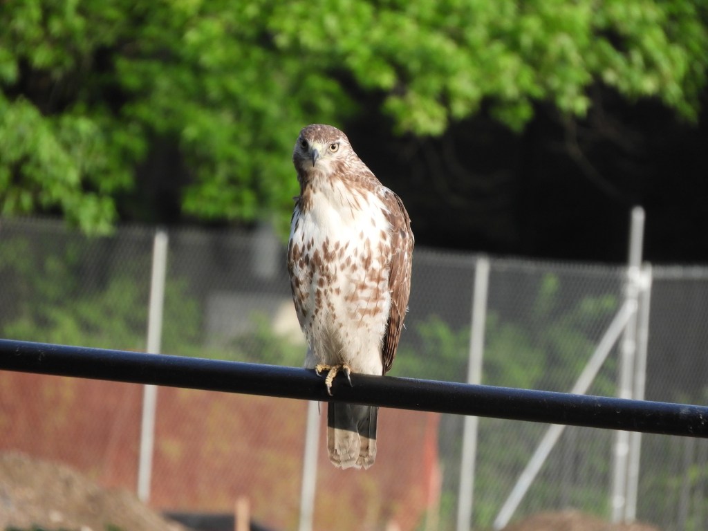 On the morning of June 8, 2025, I decided to walk home from the park by a different route. I had just been thinking that I missed seeing Red-tailed Hawks, my usual company during the fall and winter months. At that moment, serendipity struck when my eye landed on a beautiful Red-tailed Hawk perched on a fence at the Inwood baseball fields.