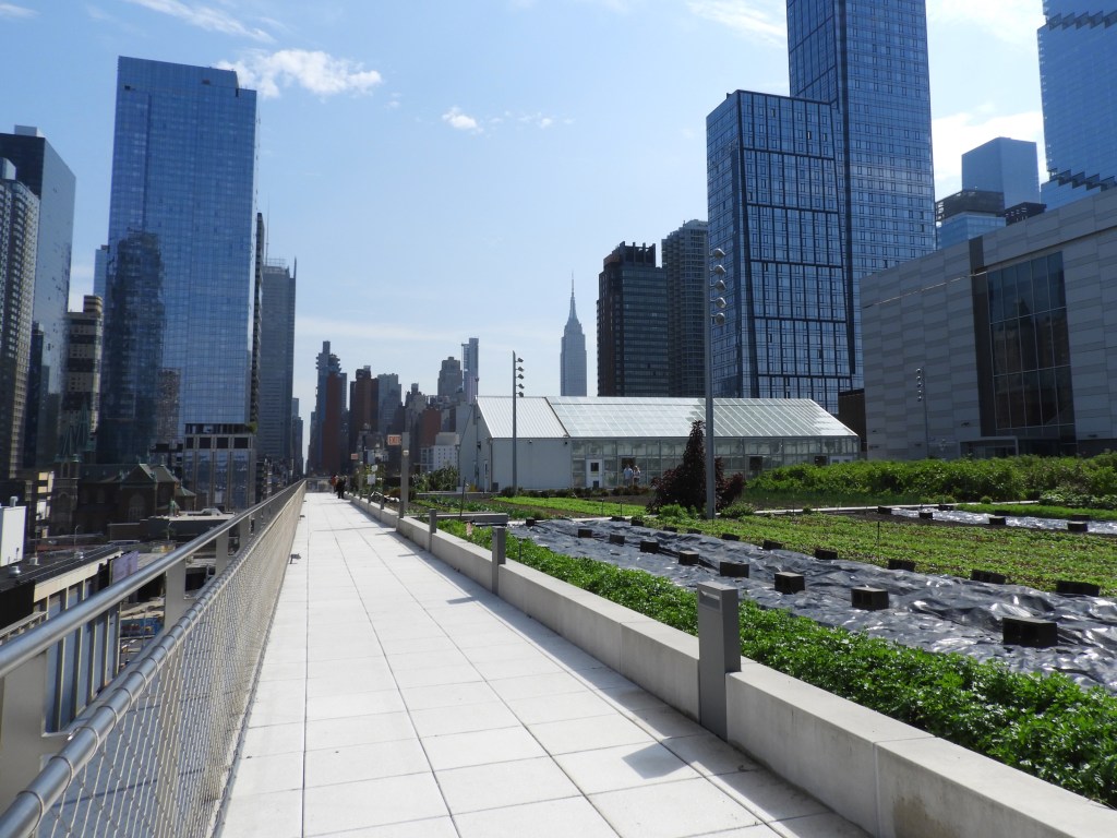 The roof also features an orchard, a one-acre farm, and a greenhouse. The infrastructure includes solar panels and shallow beds of sedum that absorb thousands of gallons of rainwater.