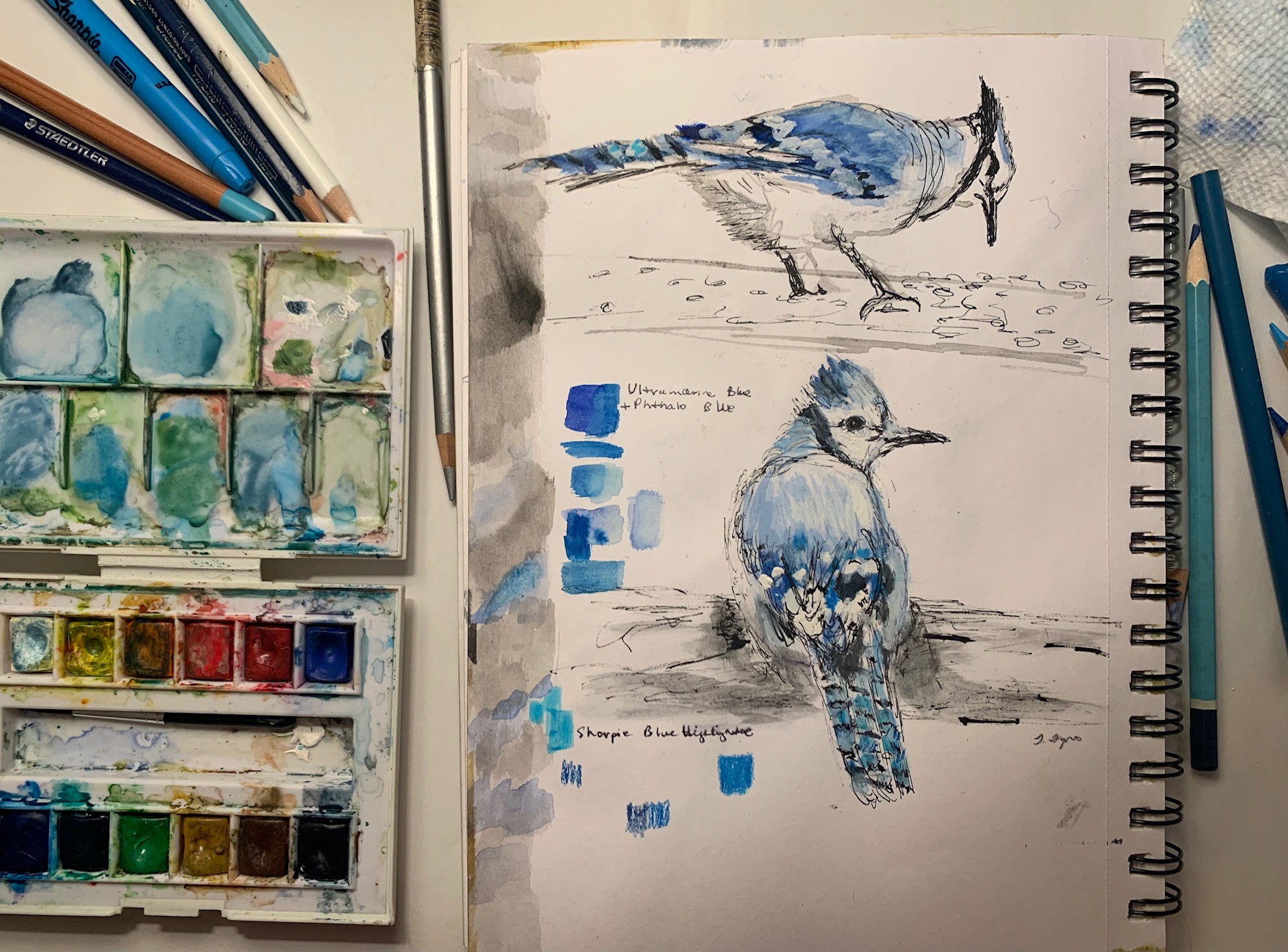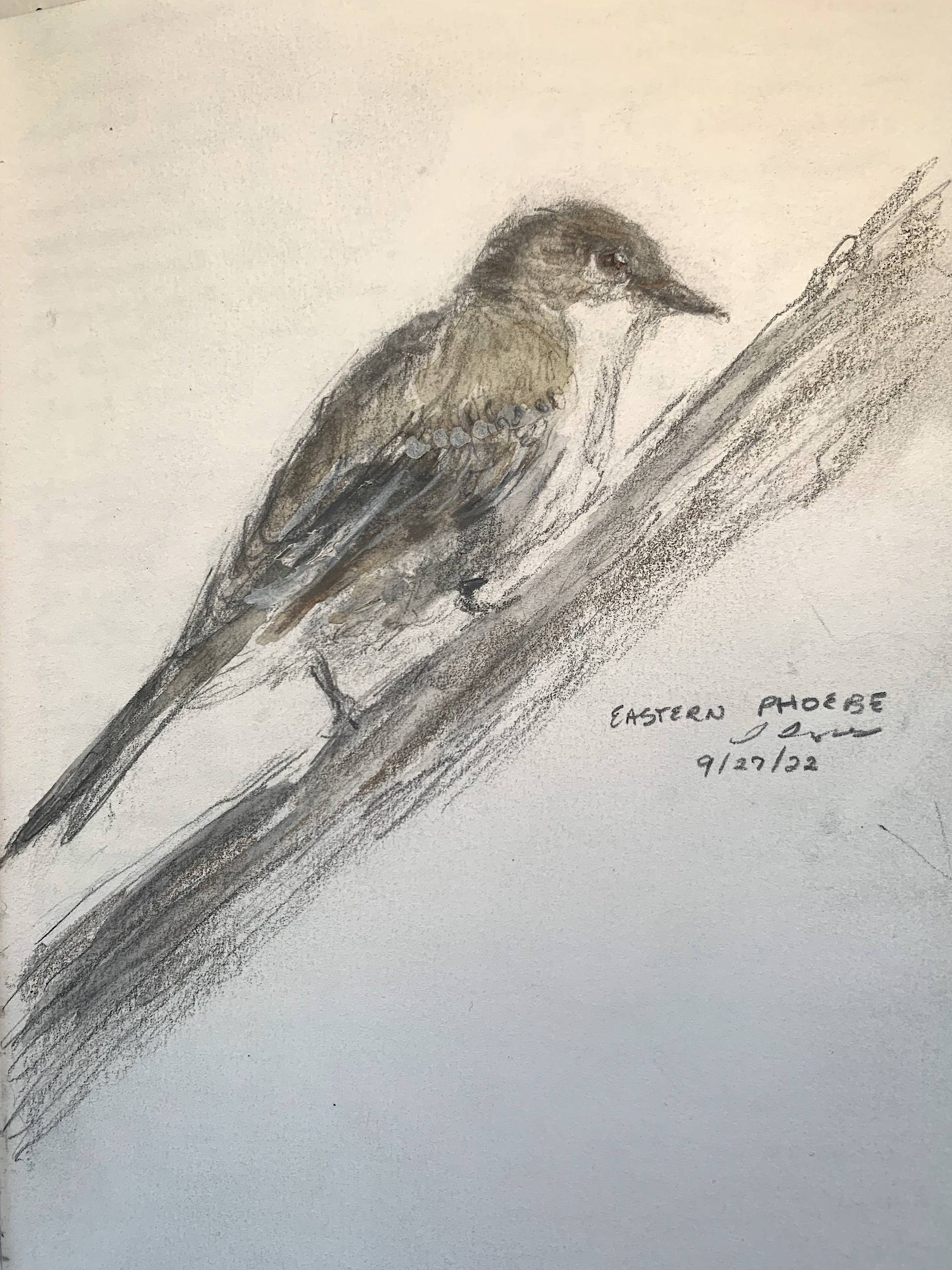 Read more about the wrens and my drawing process in the post The Wrens of Inwood. “When painting birds, I tend to make the underlying drawings in water-soluble graphite and then apply watercolor washes to fill out the color. For details, I will use colored pencils and ink to emphasize the darkest markings and the eyes. I make those lighter markings often with white gouache, a chalky medium in the painter’s toolkit. I’ll use my photographs as references and a point of departure, but I still strive to represent the personalities of these birds in the tradition of academic fine arts drawing.”