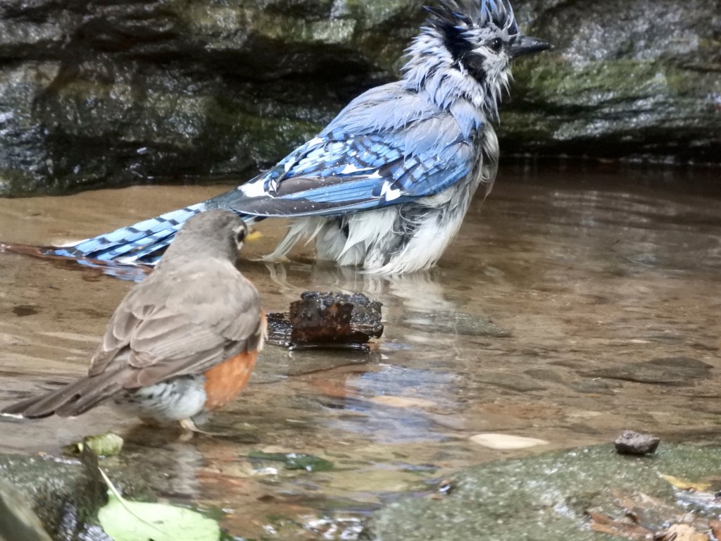 June 17, 2024. As a heat wave begins in the New York area, the birds of Inwood have been flocking to the natural springs in Inwood Hill Park to bathe and to drink the cool water. The natural springs area is located next to the semicircular path around the athletic fields. Read more about the natural springs in the recent post, A Common Grackle Takes the Waters of Inwood Hill Park. Several bird species appeared at the springs, as noted in the slideshow below.