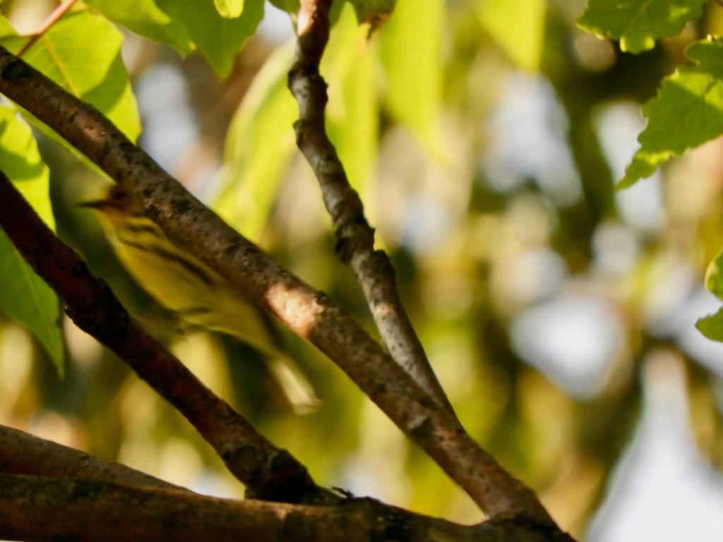 High migration observed on September 8, 2025. At around 7:20 a.m. I encountered a flurry of migratory warblers and others near the “Parapet” wall and trail high in the park.