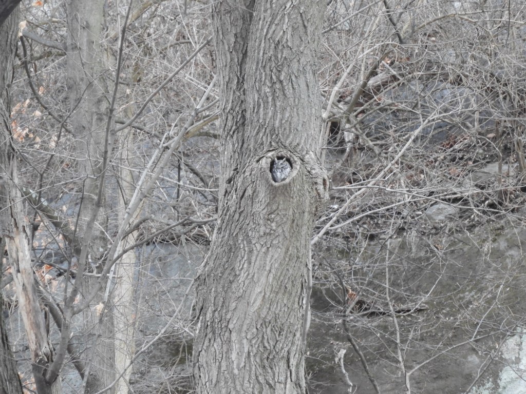 Note on owls that may be present: Certain species of owls will not be recorded here out of abundance of caution. One exception – the Eastern Screech-Owl that is well-known in this part of the woods. The little owl has returned for the season but rarely sticks its head out of the crevice. Still, last season, the little owl vacated the crevice home after a potential mate was spotted and crowds had convened.